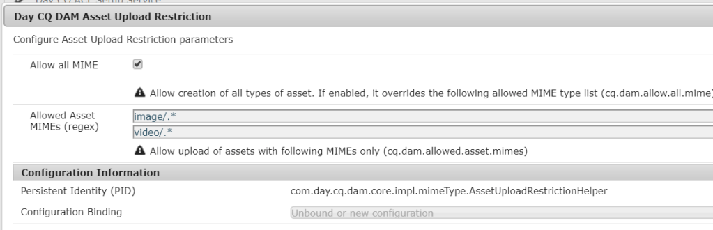 - Configure “Day CQ DAM Asset Upload Restriction“. Deselect “Allow all MIME”