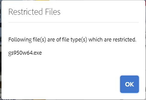 Once the configuration is done, you can test the files by uploading them to AEM. For restricted files, you would receive error message similar to the image attached below:
