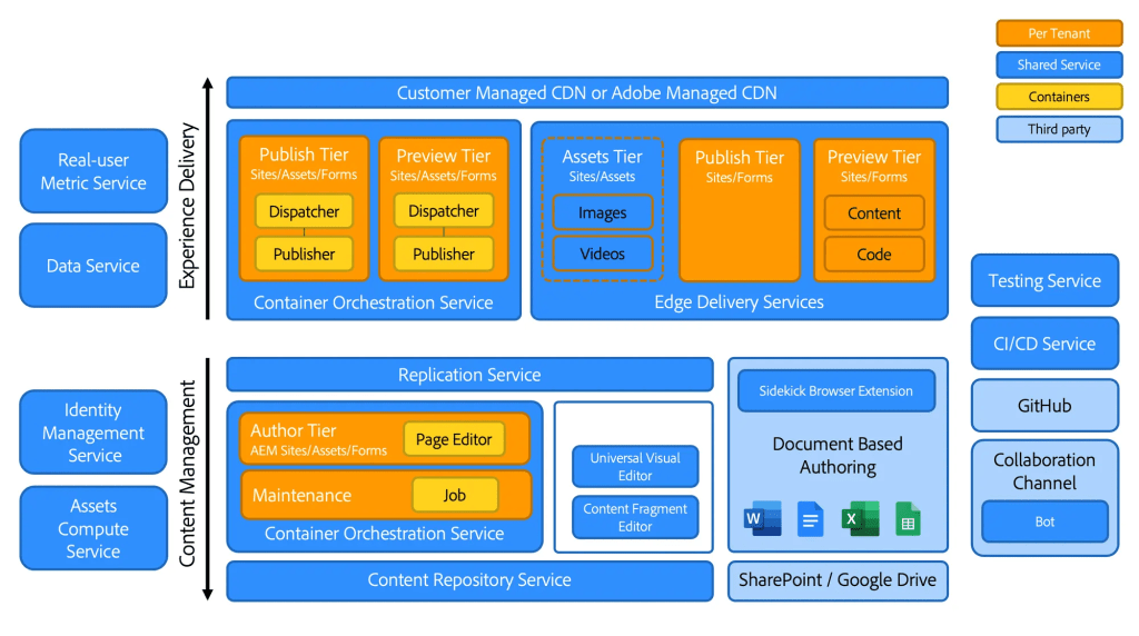 - Containerized Deployment: Author and Publish tiers are implemented as Docker containers, orchestrated by a Container Orchestration Service.
