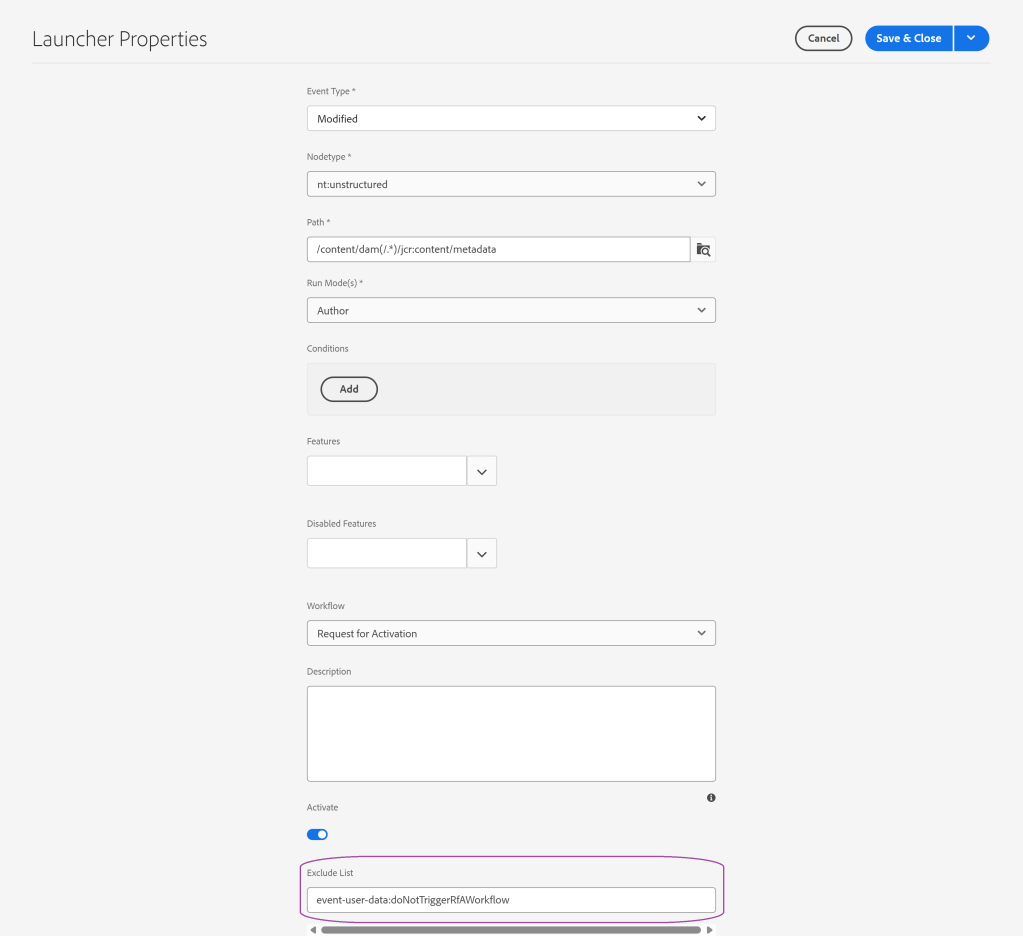 In Adobe Experience Manager (AEM), you can prevent a Workflow Launcher from triggering when changes are made by specific users or automated processes. This is especially useful when you want to avoid triggering workflows during metadata modifications via specific services.